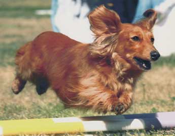 ![]() Brandy jumping the 4" double jump at the DCA National Agility Trial in March 2004. (Photo by Tien Tran) |